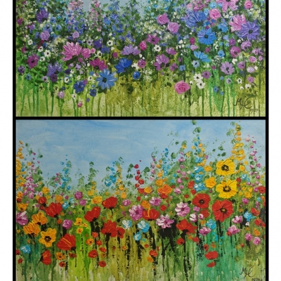 Seit 2025 biete ich auch die Technik mit Acrylfarbe in Verbindung mit Strukturpaste für fröhlich bunte Blumenmotive als Malkurse an. Hierbei arbeiten wir mit Hilfe von Pinsel und Spachtel etwas abstrakter und müssen uns nicht so genau an die Bildvorlagen halten, wie es ja sonst bei den Gemälden mit Pastellkreide üblich ist. Dabei kann jeder frei über seine Farbkompositionen entscheiden, wodurch man eine besondere Freiheit und Freude beim Malen empfindet, was ich aus eigener Erfahrung nur empfehlen kann.